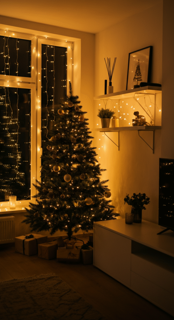 Whether you use fairy lights, tree lights, or curtain lights, keeping them warm-toned transforms your space into a calm, glowing holiday retreat.