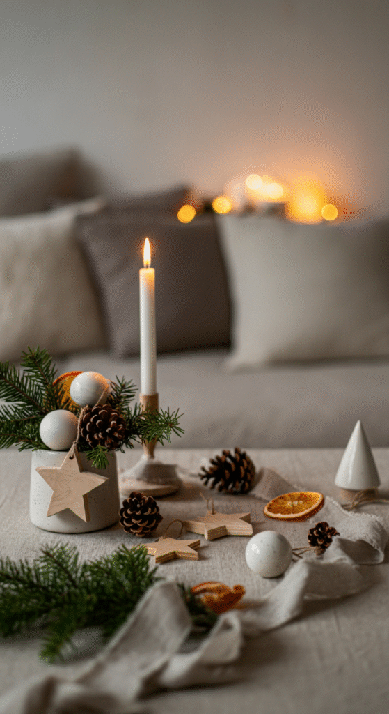 A clean aesthetic begins with your palette. Modern cozy décor avoids the overly bold red-and-green formula and focuses on soft tones—warm whites, creamy beige, latte browns, muted golds, and natural greens.
