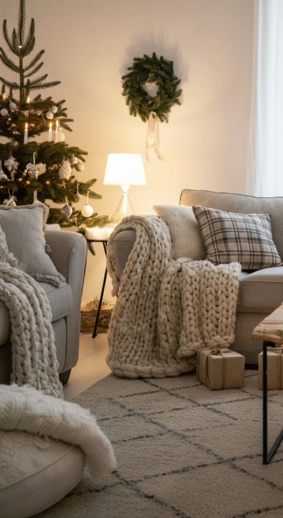 Layering textures is one of the most underrated ways to build a cozy Christmas living room. Instead of adding more décor, modern styling focuses on adding warmth through fabrics.