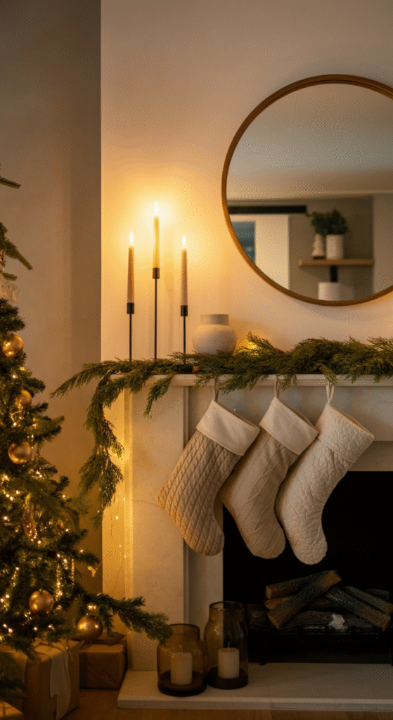 Your fireplace mantel becomes the focal point of the living room during Christmas. A modern, cozy aesthetic demands simplicity and balance—no cluttered collections or oversaturated colors.
