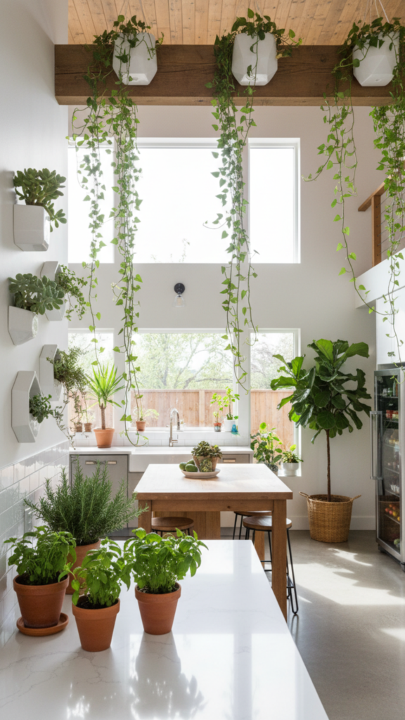 - Hang trailing plants like pothos from the ceiling or high shelves.