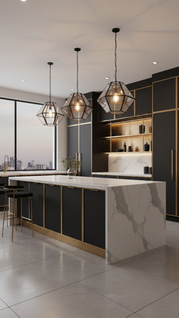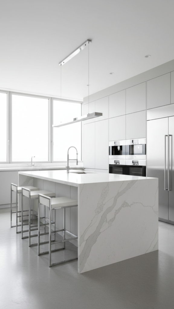 A waterfall island, where the countertop material spills over the sides to the floor, is a hallmark of luxury modern design.