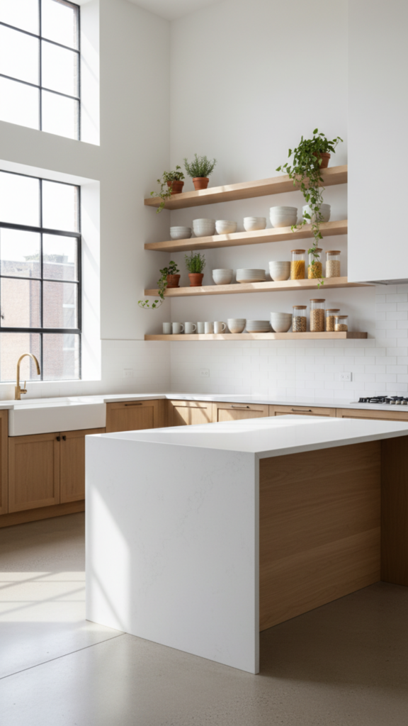 Open shelving does require more dusting than closed cabinets. It also forces you to stay organized since everything is on display. However, it makes accessing daily items much easier.