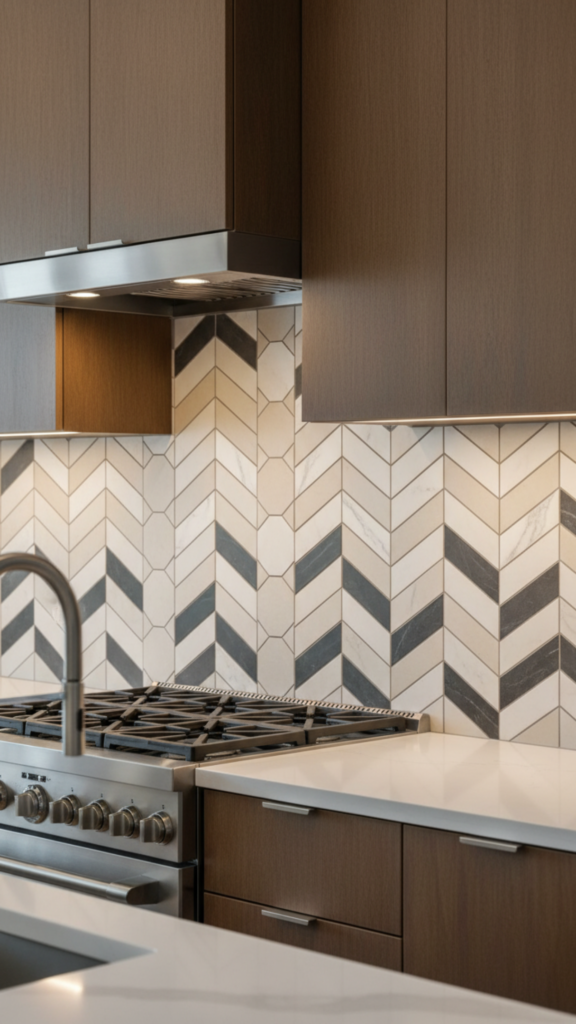 Subway tiles are timeless, but geometric patterns are trending. They add texture and visual interest to the cooking area.