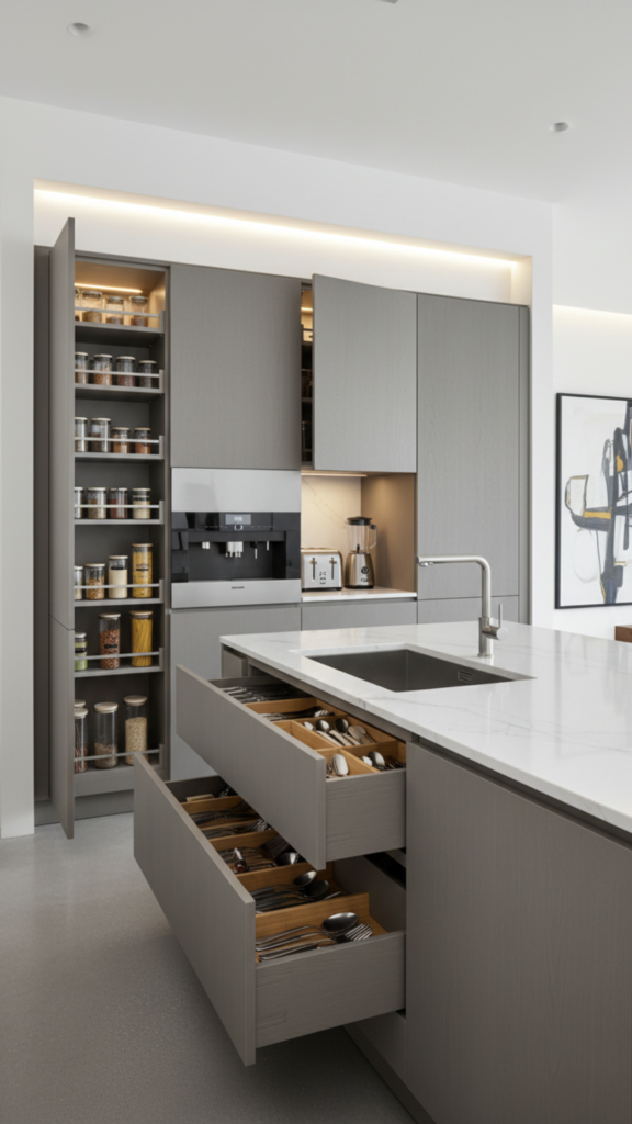 Clutter is the enemy of modern design. Intelligent storage keeps countertops bare and essentials tucked away but accessible.