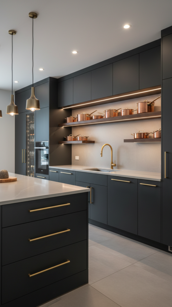 Gold, brass, and copper add warmth to stark modern kitchens. They look especially striking against dark navy or black cabinetry.