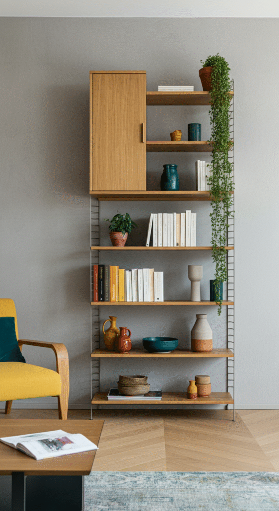 Choose sleek wooden or matte-black shelves to complement a modern look. Arrange a balance of décor pieces — books, art frames, and small plants — with breathing space in between.