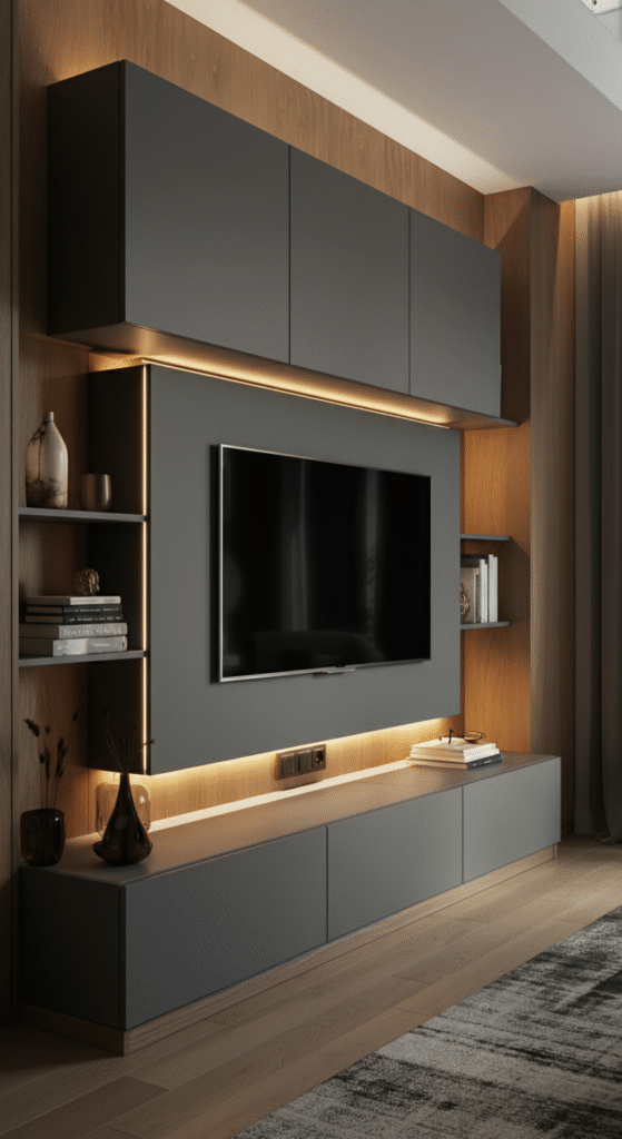 Modern built-ins are sleek, symmetrical, and multifunctional. They hide cables, organize gadgets, and provide display zones — all in one unified structure.