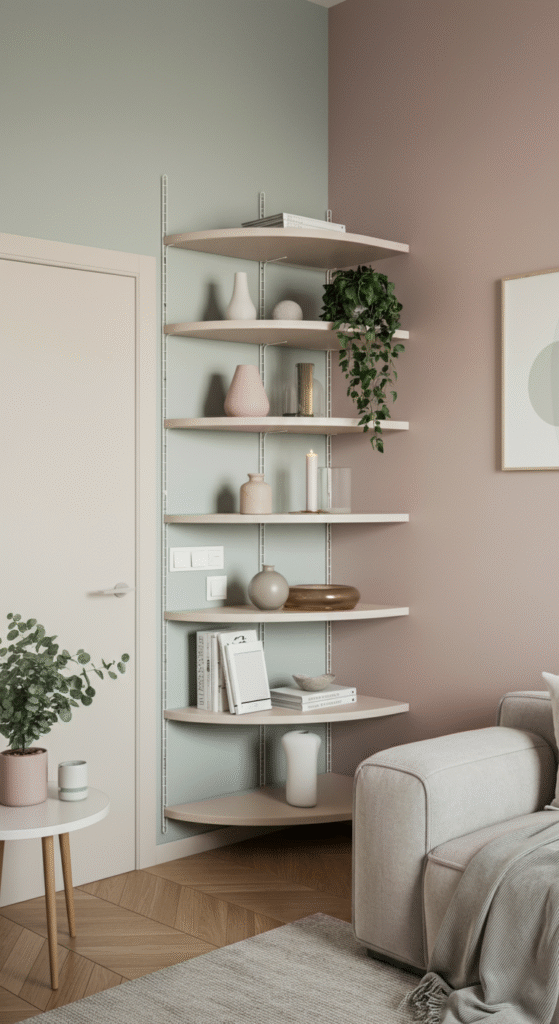 Curved or geometric corner shelves also help soften sharp architectural edges, creating visual balance.