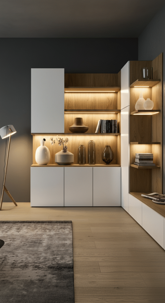 Modern living room storage is no longer about tucking things away — it’s about designing with intention.