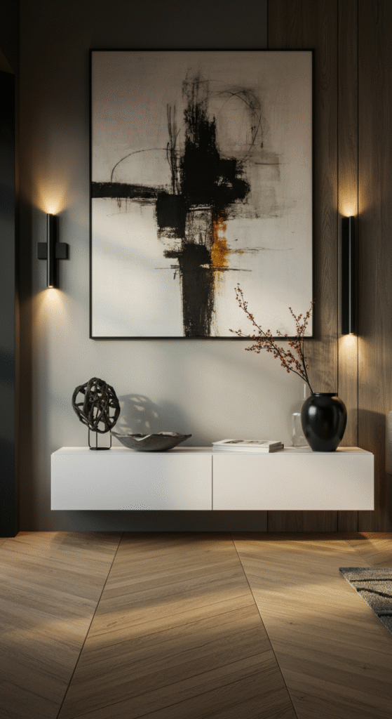 Pair a floating cabinet with a large statement artwork above — a modern design classic that adds symmetry and sophistication.