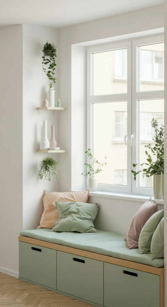 If your living room has a window nook — congratulations, you’re sitting on prime real estate for storage.