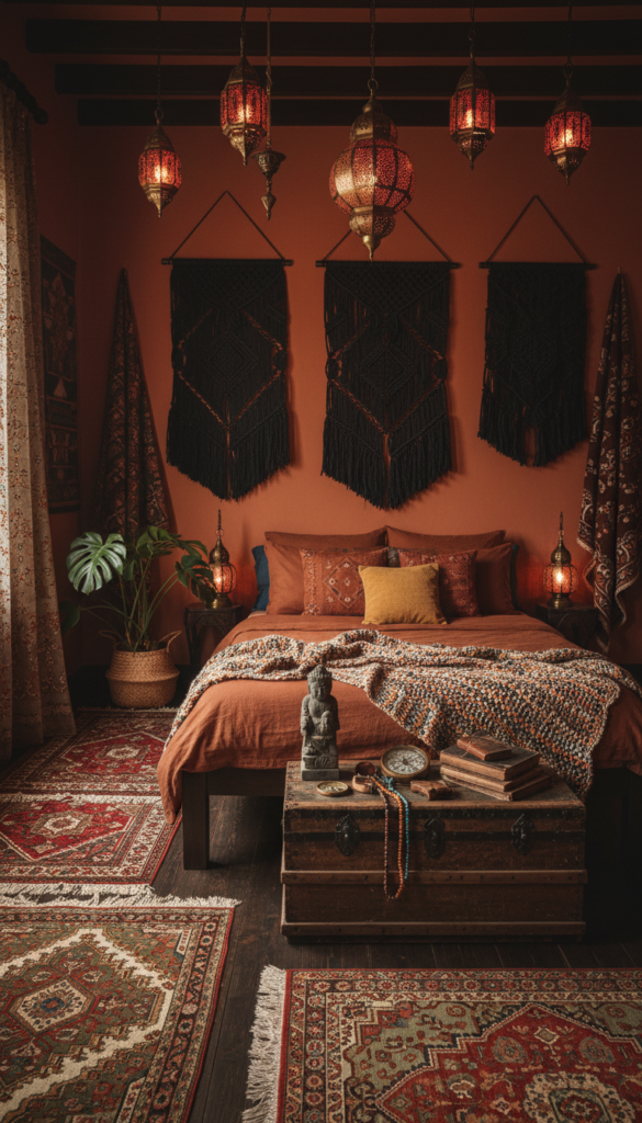 Boho doesn’t always mean bright colors. This moodier version uses terracotta, deep rust, and black macramé to create a cozy, traveled vibe.
