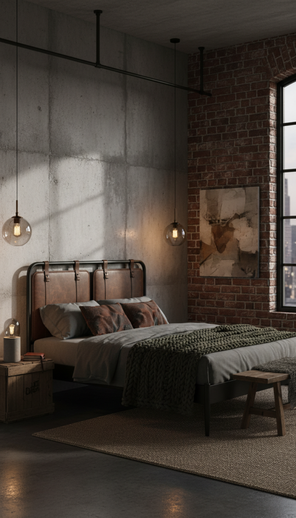 Exposed elements meet deep shadows in this raw, masculine aesthetic. It relies on concrete, metal, and leather to build a moody vibe without feeling cluttered.