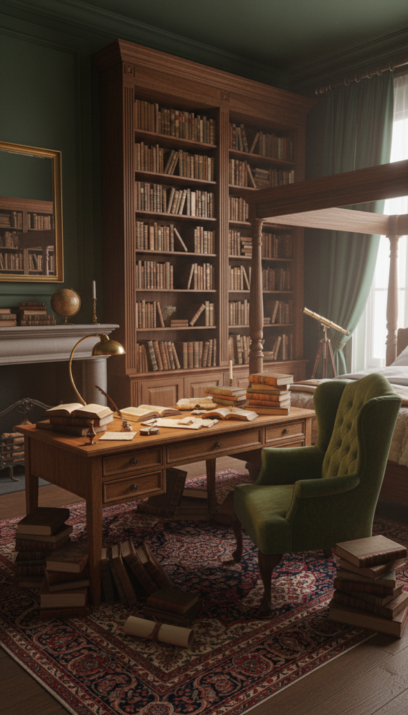 - Decorate with stacks of vintage books and leather-bound journals.