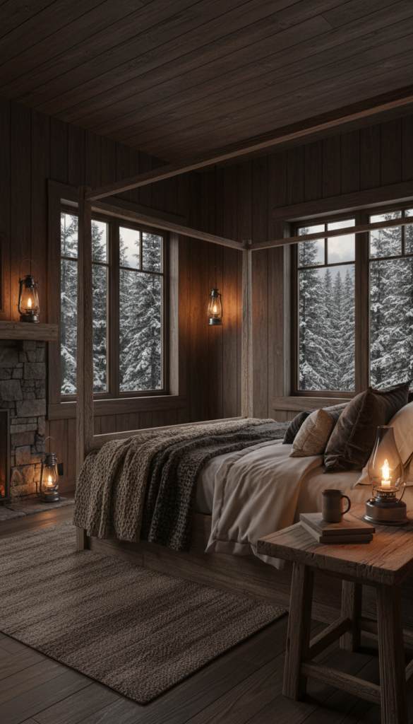 This is the cabin aesthetic reimagined with a moody twist. Raw wood meets charcoal grays and deep browns for a grounded, earthy retreat.