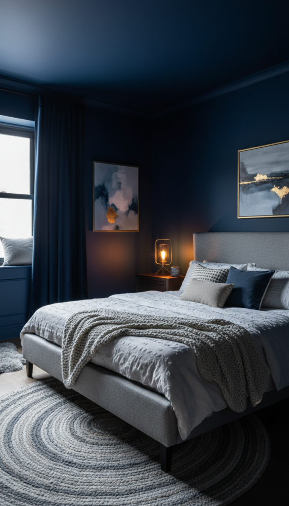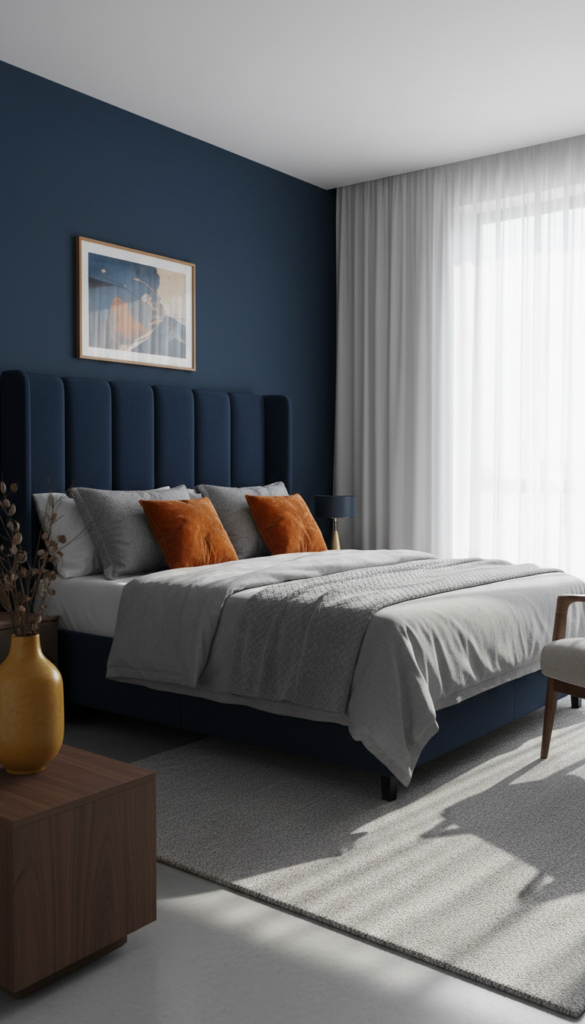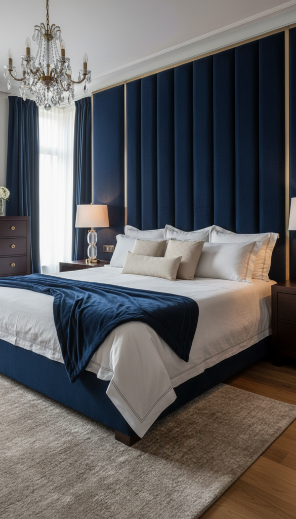 Navy blue is the “little black dress” of interior design. It is timeless, sophisticated, and deeply calming, making it the perfect choice for a bedroom sanctuary. While light neutrals are often the go-to for sleeping spaces, a deep, rich navy wraps the room in a sense of quiet luxury that lighter shades simply cannot replicate.