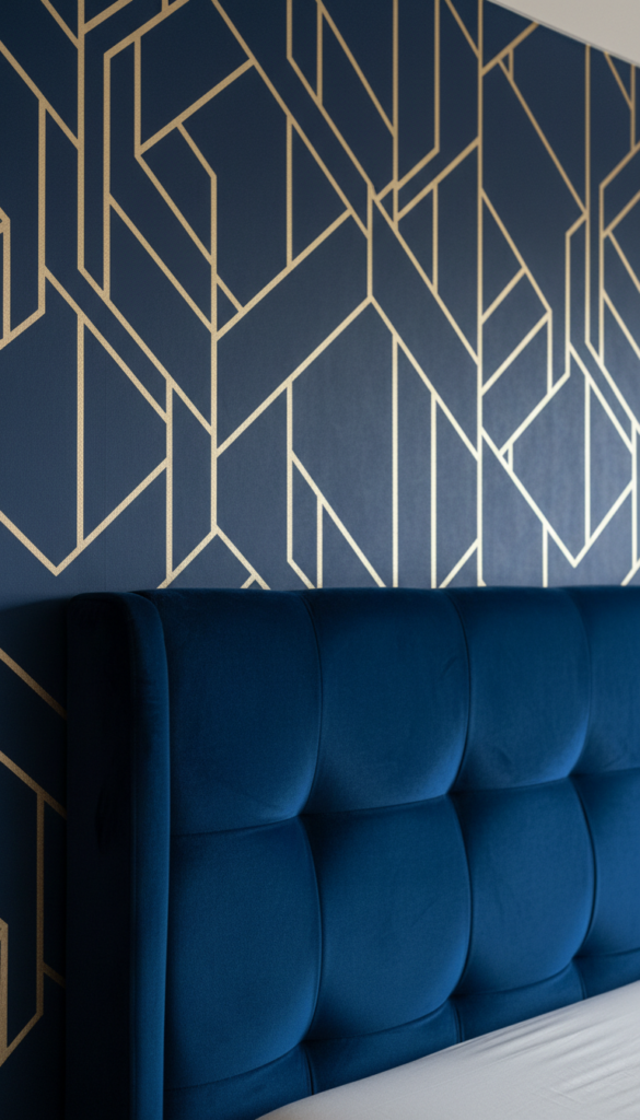 Solid paint isn’t the only option. A navy-based wallpaper adds pattern and interest while maintaining the color scheme.