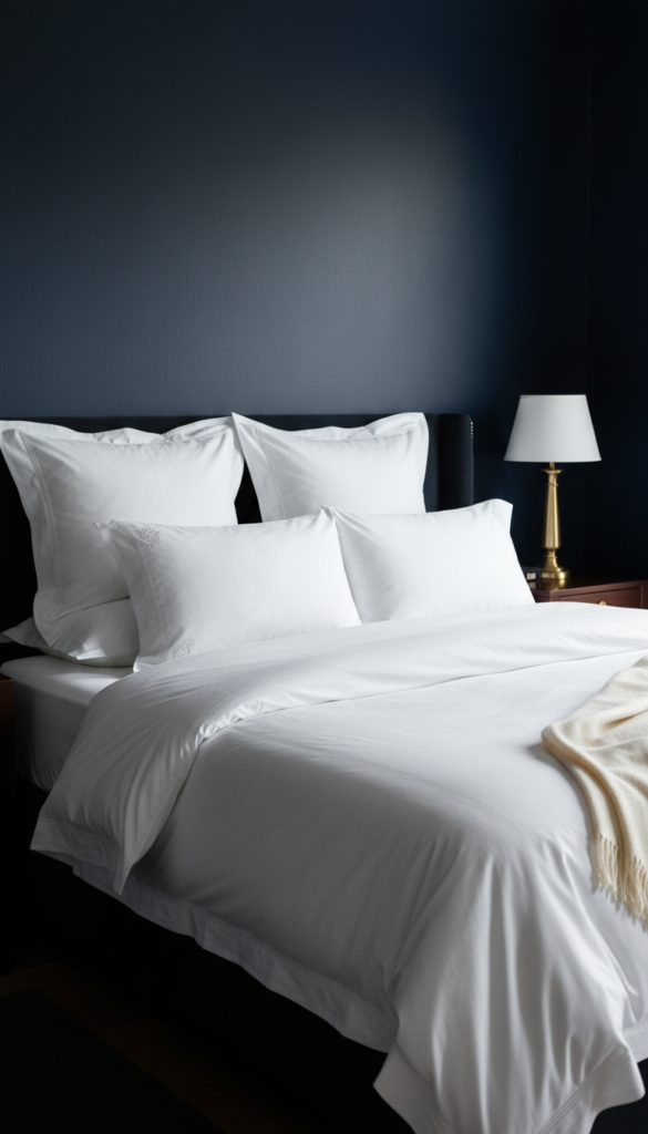 Nothing says “luxury hotel” quite like the combination of dark navy walls and stark white bedding. The contrast is sharp, clean, and incredibly inviting.