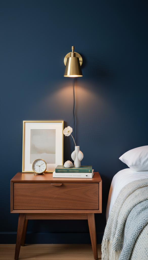 Navy is incredibly versatile. It pairs beautifully with white furniture for a coastal look, dark wood (like walnut) for a moody, masculine vibe, or light oak for a Scandinavian aesthetic.