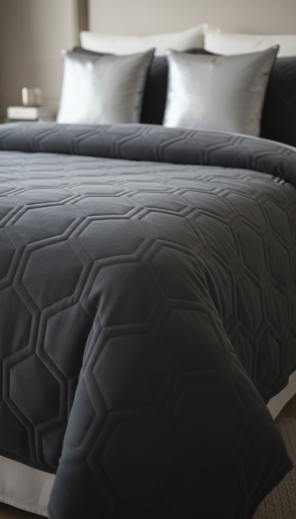 - Look for geometric quilting patterns or duvet covers with tech-inspired prints.