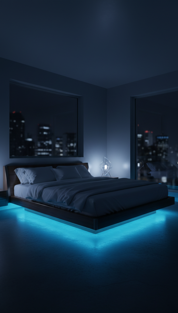 Create the illusion of anti-gravity with a floating bed. This sleek design element makes the room feel more spacious and significantly more futuristic.