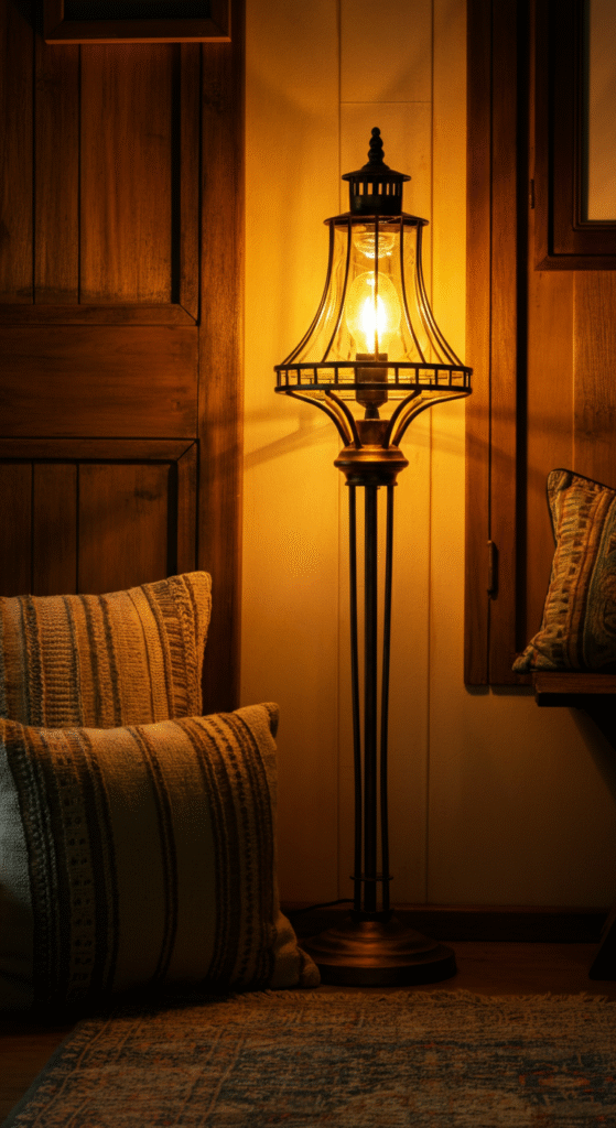 A lantern-style floor lamp can provide an elegant, yet rustic charm to your living room. Unlike smaller table lanterns, these floor lamps make a bold statement, acting as a functional light source while adding an ornamental touch to your decor.
