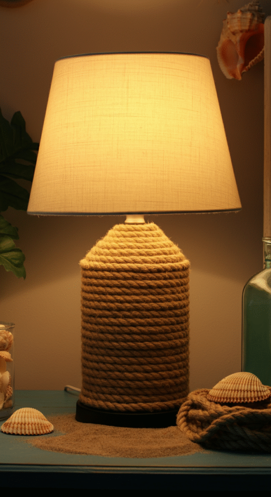 Rope-wrapped lamps are a unique way to combine rustic textures with coastal influences. The rough texture of the rope around the base of the lamp creates a rugged look that is softened by the warm light emitted from the bulb.