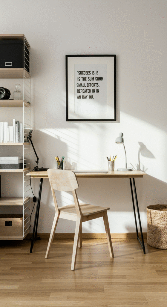In Scandi style, less is more, and minimalist quotes can be incredibly impactful when styled correctly. Think of simple, one-word quotes like “Breathe,” “Calm,” or “Create.” These words, when placed in a sleek, modern frame, have the ability to anchor the space without overwhelming the senses.