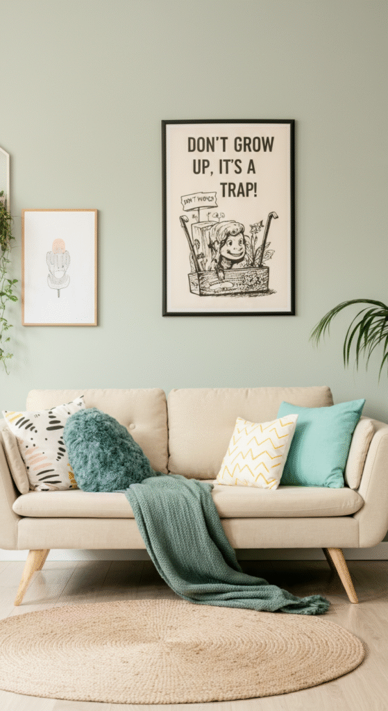 If you prefer a more lighthearted approach to your décor, playful quotes can inject personality and fun into your Scandi living room. Think phrases like, “Don’t grow up, it’s a trap!” or “Life is better when you’re laughing.” These quirky statements not only break away from the typical minimalist style but also serve as conversation starters.