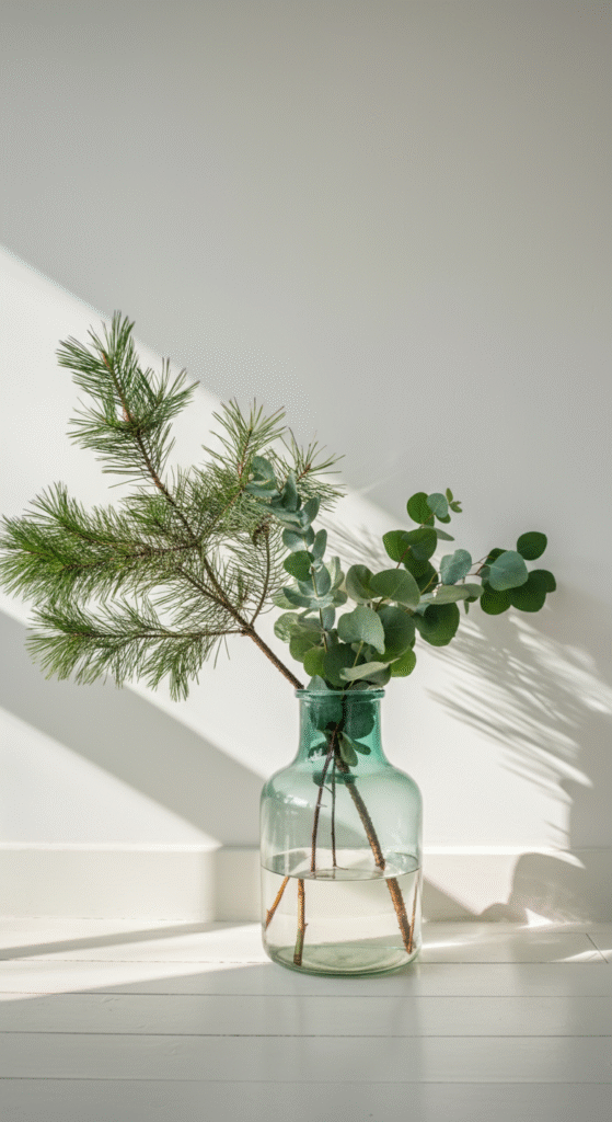 Minimalist Scandinavian décor starts with nature. Forget synthetic garlands and go for fresh pine, fir, or eucalyptus branches. Place them in simple vases or drape them over mantels, shelves, and dining tables.