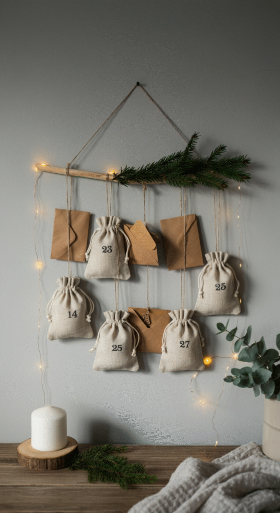 Use linen bags, kraft paper envelopes, or small wooden boxes numbered 1–24. Fill them with handwritten notes, small treats, or mindful tasks—like “take a walk in nature” or “light a candle for gratitude.”