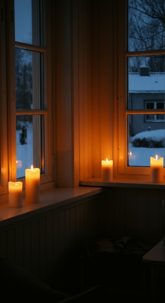 Scandinavian Christmas homes glow with soft, diffused lighting—never harsh or bright.
