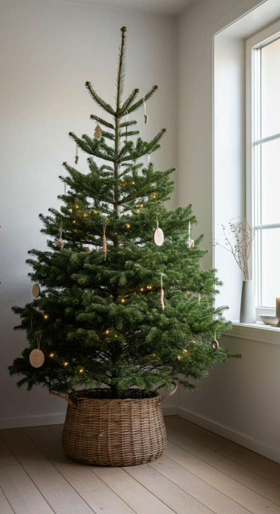 Opt for a real or realistic tree and decorate it sparsely. Use white lights, wooden ornaments, and touches of linen or paper garlands. The magic lies in negative space—letting the tree’s natural texture breathe.