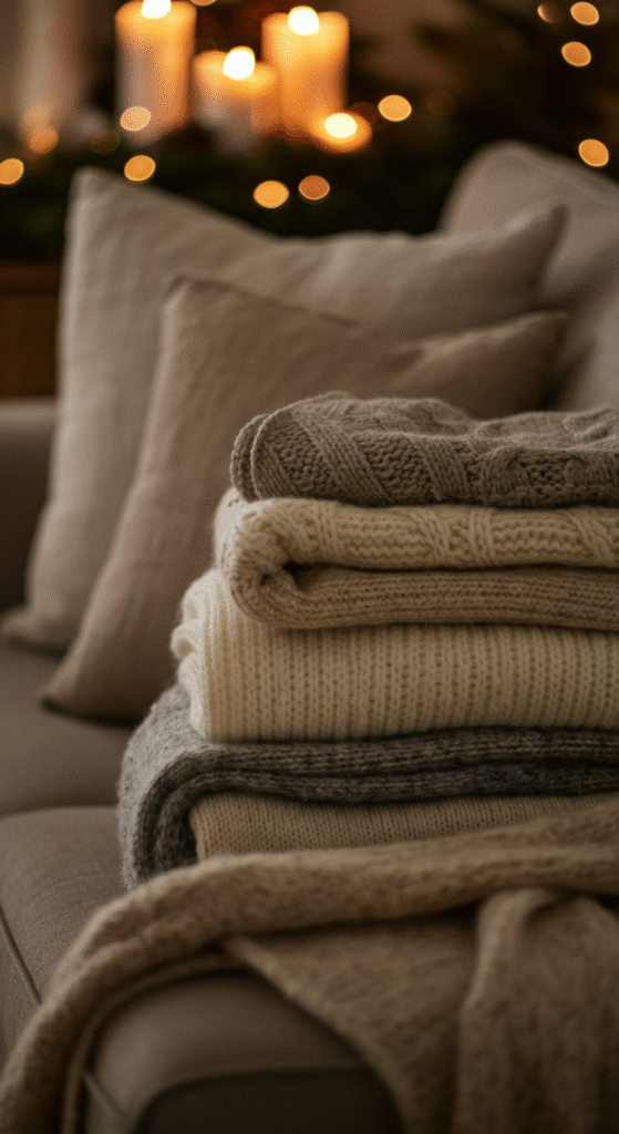 Layer your living spaces with wool throws, knitted blankets, and linen cushions. Choose neutral tones like ivory, sand, or light grey. The tactile comfort makes your space inviting without visual clutter.