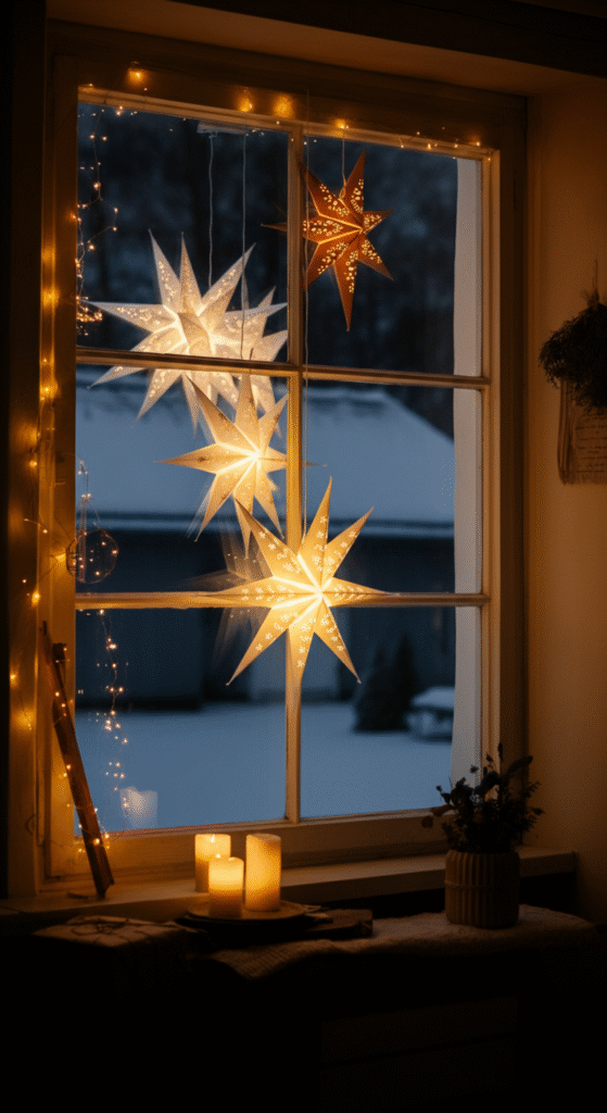 Hang paper stars in your windows or above your table. Choose muted tones like white, beige, or dusty pink. These stars are not just decorative—they are symbolic of hope, guiding light, and introspection.