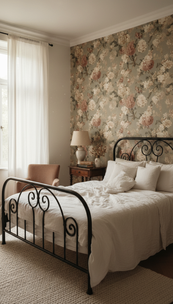 In a bedroom, a floral accent wall behind the bed adds romance while keeping the rest of the space calm and breathable.