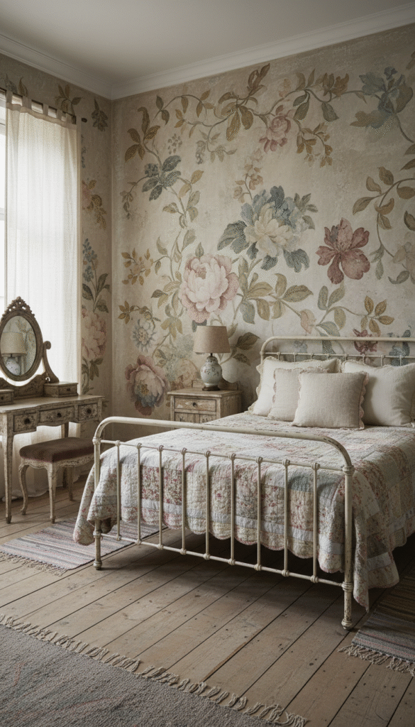 A faded mural-style accent wall adds artistic depth and individuality to a vintage bedroom.