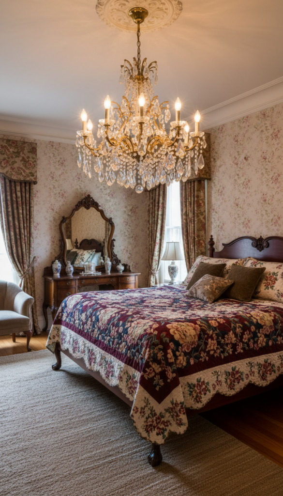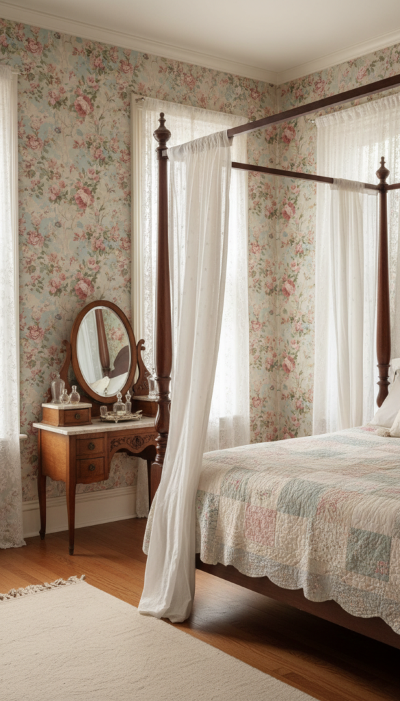 Floral wallpaper is a classic element of vintage bedrooms, and when paired with soft, pastel shades, it creates a whimsical, romantic atmosphere. Antique floral prints, especially those in faded hues, are a popular choice for creating a dreamy vintage vibe.
