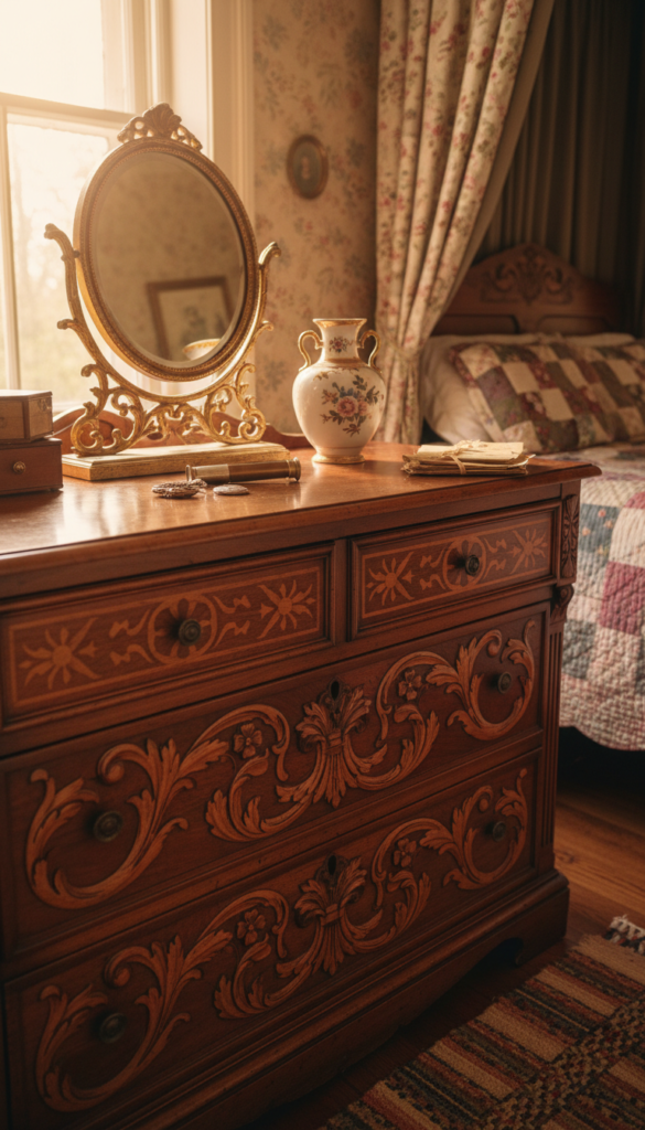 Today, an antique wooden dresser adds warmth and sophistication to a vintage-themed bedroom. Pair it with a vintage mirror and some soft, decorative items like candles or old books to complete the look.