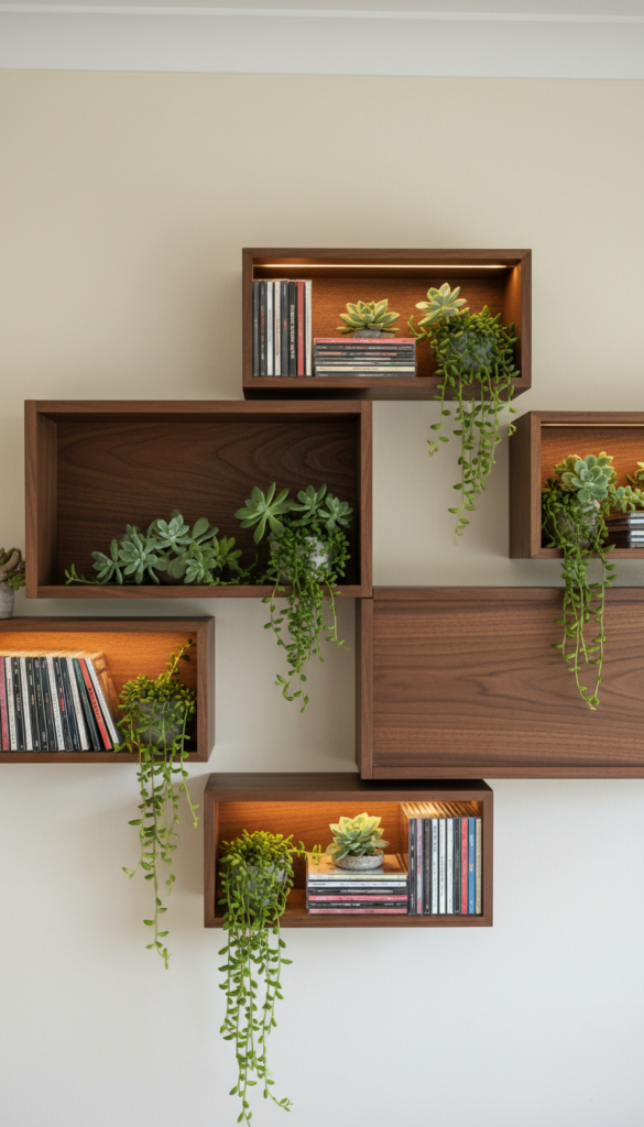 - Install simple floating ledges or “now playing” vinyl mounts.