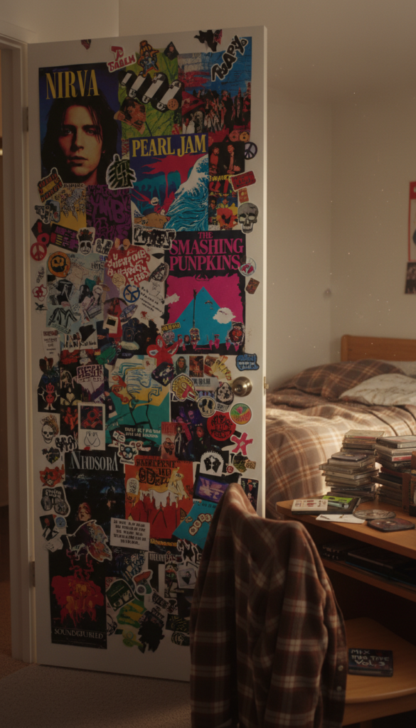 Channel the angst and energy of the 90s by decorating the back of your bedroom door. This is a chaotic, layered look that feels personal and raw, reminiscent of teenage rebellion.