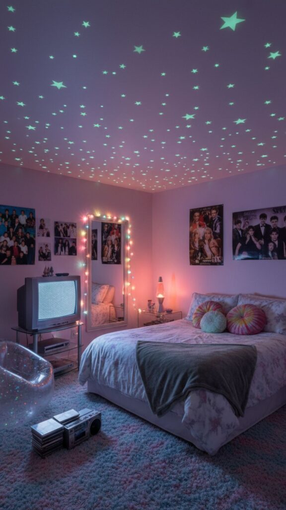 When the lights go out, the Y2K aesthetic keeps shining. Plastic glow-in-the-dark stars stuck to the ceiling are a simple, nostalgic addition that transforms your room into a private galaxy at night.