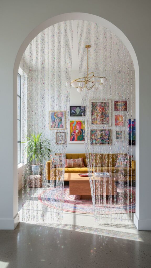 Swap your standard bedroom door for a cascading wall of beads. This staple of the era adds movement and a satisfying “clatter” sound every time you enter or exit. It separates spaces without blocking light, keeping the vibe airy and open.