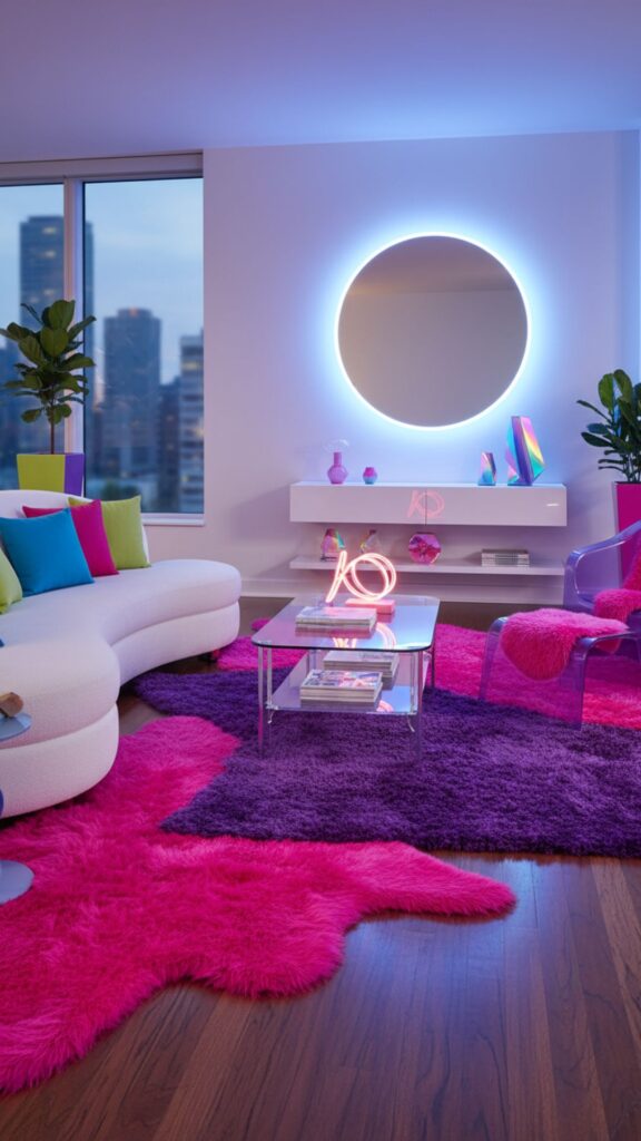 Texture is king in the Y2K aesthetic. A fluffy, fuzzy rug not only feels great underfoot but softens the look of the room, making it feel cozy and “plastic pop” all at once.