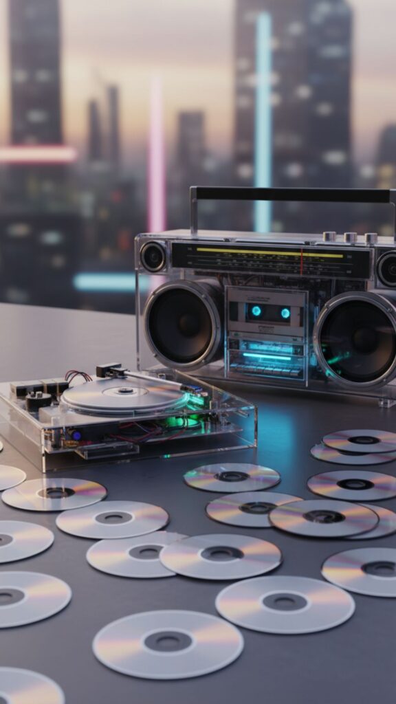 Before streaming, we displayed our music collections proudly. CD towers, boomboxes, and transparent electronics (where you can see the wires inside) are iconic Y2K staples.