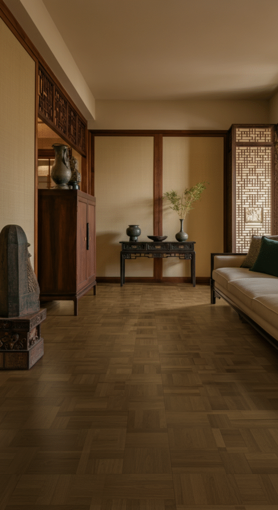 Parquet flooring brings elegance and texture to your living room. This type of flooring consists of small, individual pieces of wood arranged in geometric patterns, which can add a sense of luxury and complexity to the space.