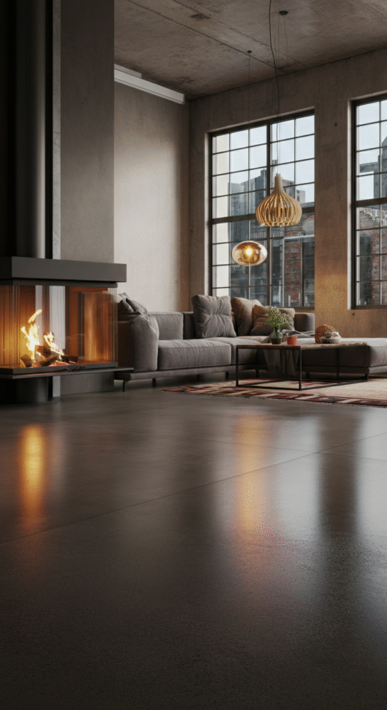 Concrete might not be the first material that comes to mind when you think of cozy living rooms, but it’s gaining popularity as a sleek and modern choice. Concrete floors can be stained, polished, or painted in various colors, making them highly customizable to suit your style.