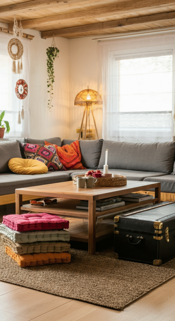 In Bohemian living rooms, furniture often serves more than one purpose. Think about a coffee table that doubles as extra seating or a bookshelf that acts as a divider between different areas. A key element of the Boho aesthetic is embracing practicality without sacrificing style.