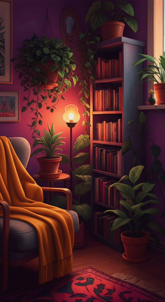 Bohemian living rooms often feature cozy corners for reading and relaxing. Set up a comfortable chair with a soft throw, a pile of books, and a floor lamp for the perfect reading nook. Add a few plants or a small rug to make the space feel intimate and inviting.